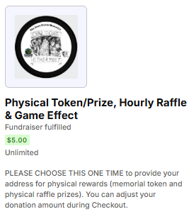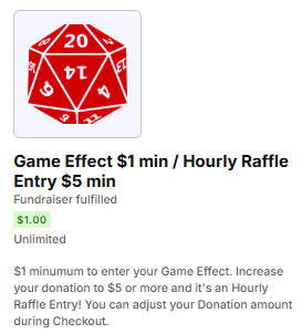 Pick “Game Effect / Hourly Raffle Entry” to indicate your Game Effect. If you donate $5 or more, your donation will automatically be entered into the hourly raffles.