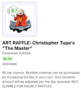 Your donation purchases raffle chances for an original art piece, The Master, by Christopher Tupa!